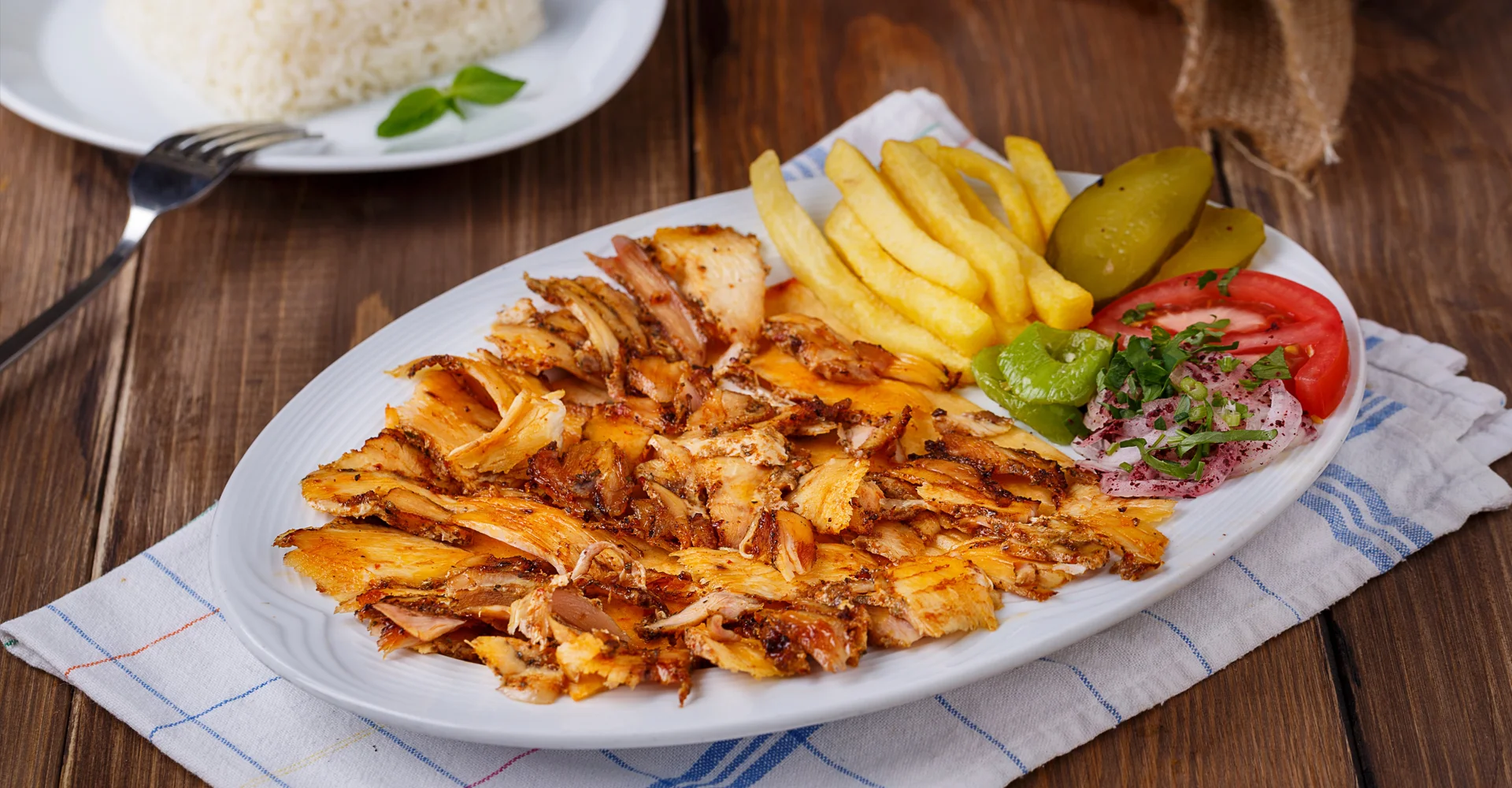 180 gr. Tavuk Döner, Pirinç Pilavı, Salatalık Turşusu, Patates Kızartması, Özel Sos, Lavaş Ekmeği170 TL
