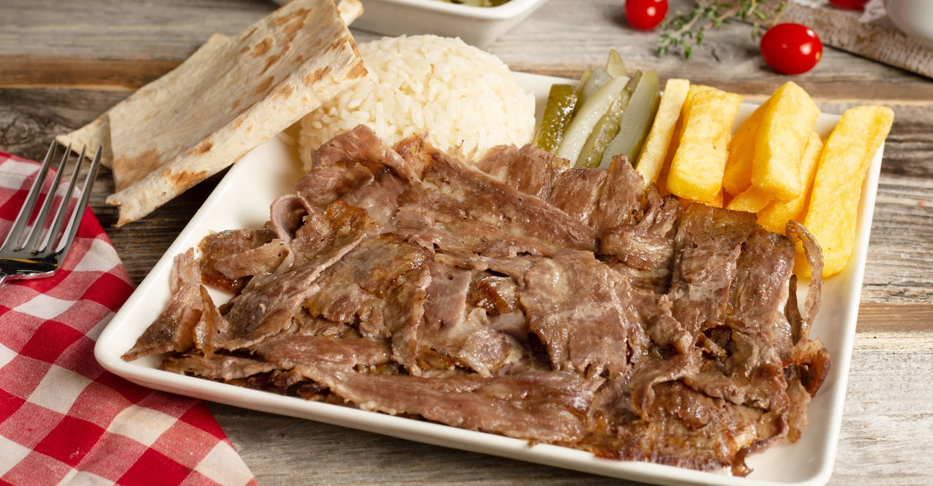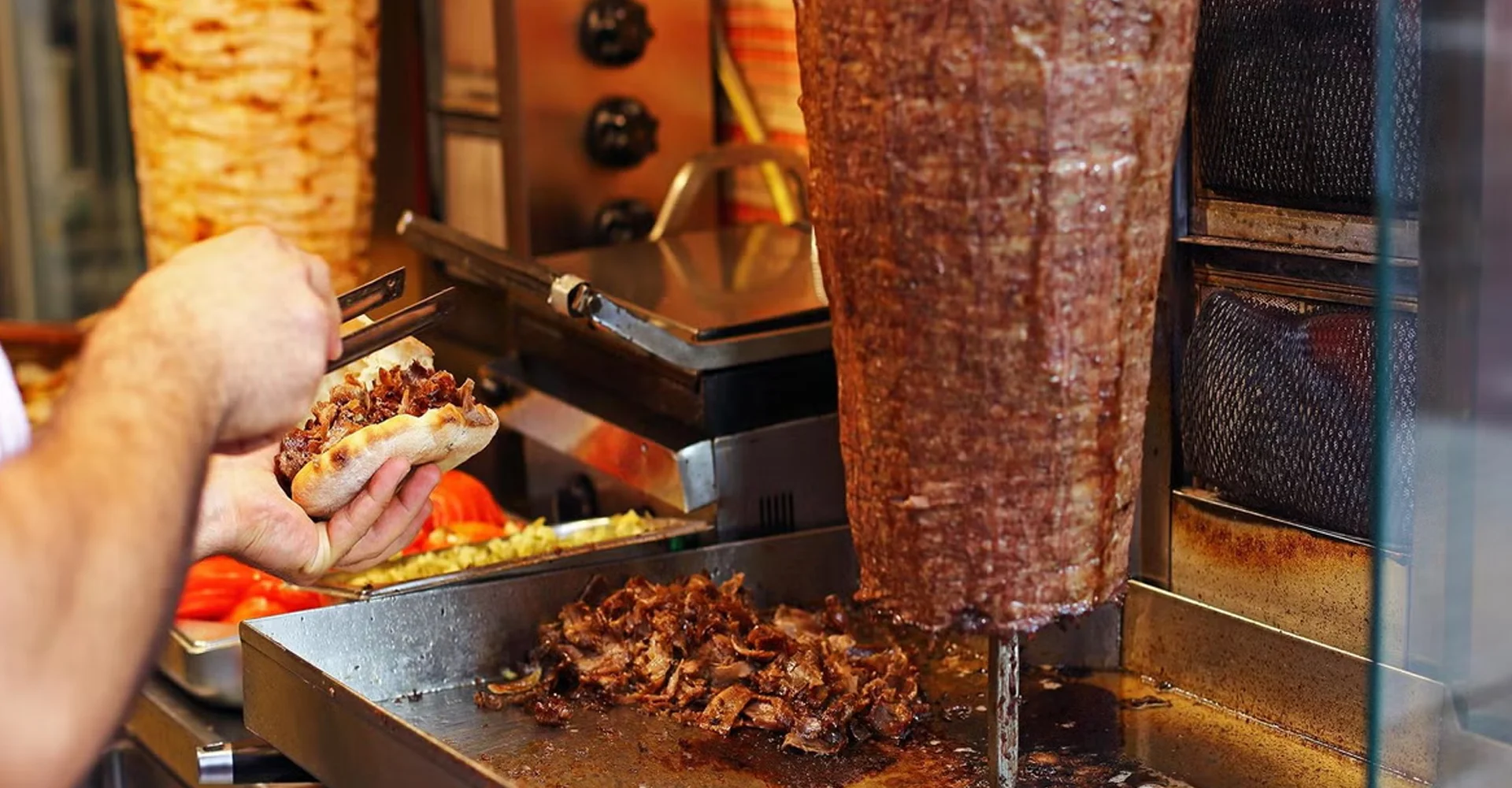 Hatay usulü döneri, özel bir baharat karışımı ve yoğurt bazlı soslarla hazırlıyoruz.