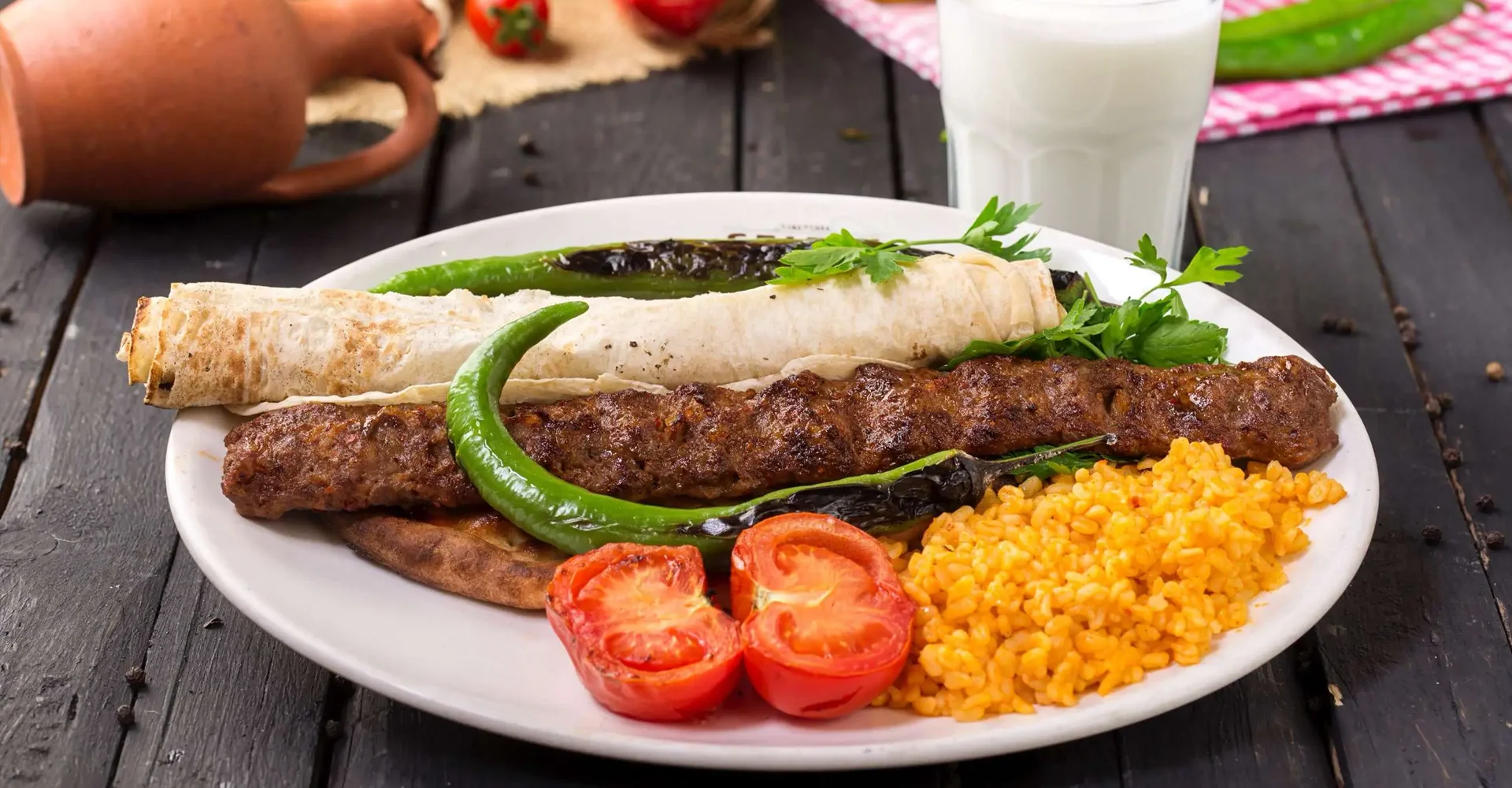 180 gr. Adana Kebap, Pirinç Pilavı, Domates, Salatalık Turşusu, Soğan, Lavaş Ekmeği320 TL
